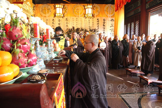 法会伊始前,中国佛学院师生排班前往涅槃堂祭拜白光长老