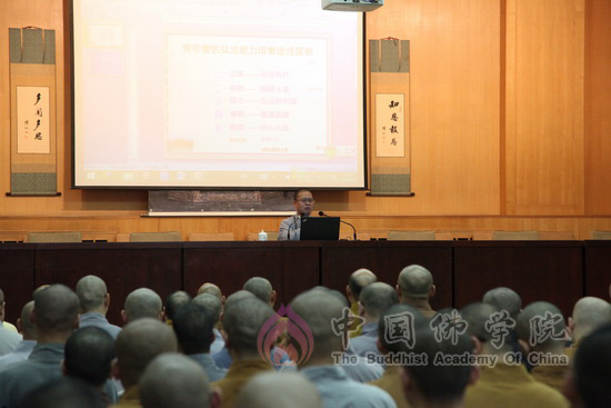 2015年8月31日下午,中国佛教文化研究所执行所长净因法师应邀在中国佛学院大礼堂,为我院全体师生作了题为《青年僧侣弘法能力培养途径探析》的专题佛学讲座。全院师生到场聆听讲座。中国佛教协会副会长、我院常务副院长宗性法师主持。