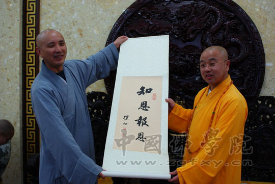 参观完寺院,净芳法师在会客厅招待大家品茗畅谈,对参访团一行的到来表示热烈的欢迎,并向大家介绍了炉峰禅寺的发展情况,法师说:“炉峰禅寺的前二十年主要是注重硬件的建设,未来将注重软件建设,目前已经成立了寺院档案室和文化宣传办公室。同时,还将积极的参与到社会的慈善事业当中”。 参访团团长向学副院长对绍兴市佛教协会、炉峰禅寺常住以及净芳法师的热情接待,表示衷心的感谢,并向炉峰禅寺赠送礼品。随后,净芳法师邀请大家共进午斋。